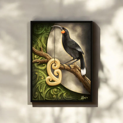 - This piece captures the extinct but legendary huia bird, proudly grasping a Māori pendant in its beak, framed against swirling green patterns and a moody sky. It’s more than art – it’s a tribute to culture, nature, and legacy.